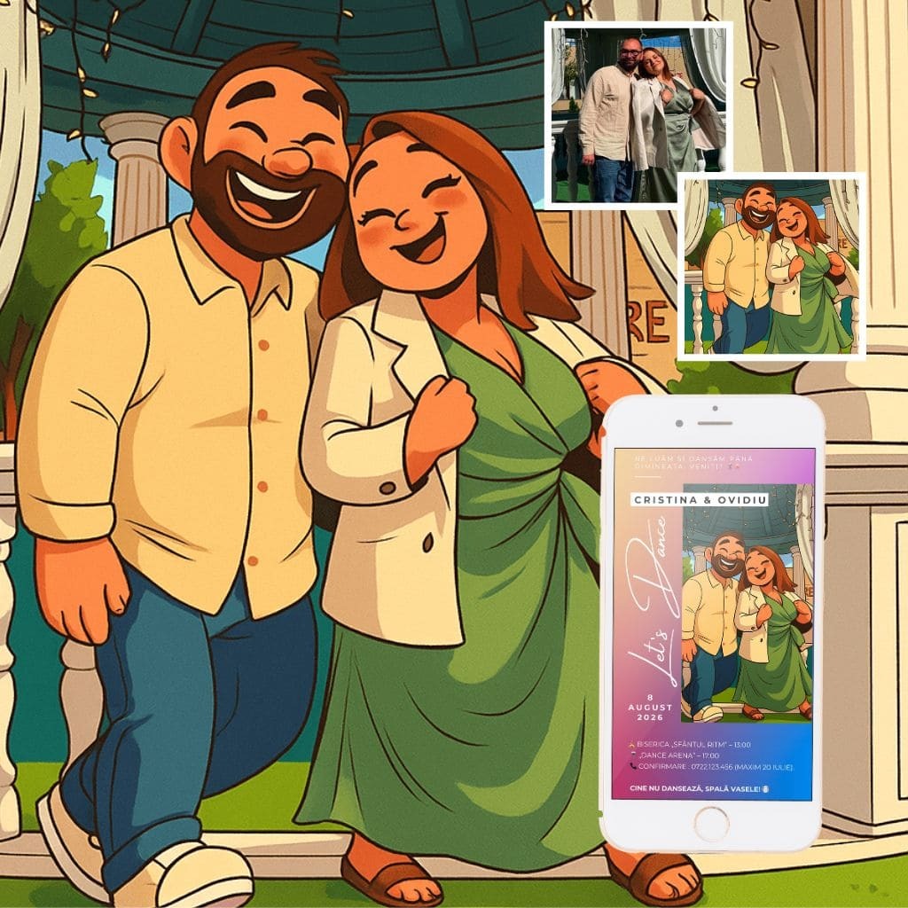 Scopul nostru este să transformăm fiecare invitație într-o mică operă de artă digitală 🎨, plină de emoție și voie bună, care să aducă zâmbete și entuziasm invitaților încă dinainte ca evenimentul să înceapă! 🎉💌