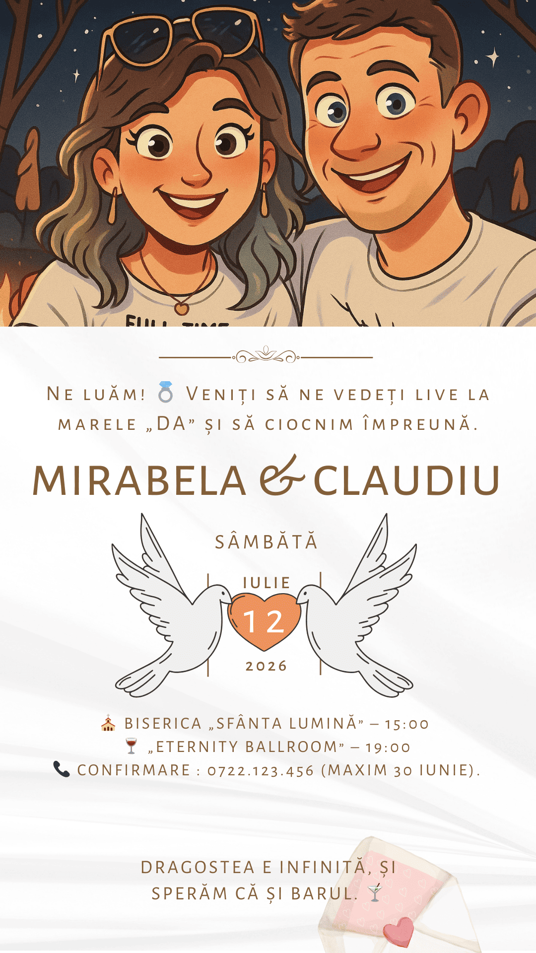 💌 Personalizare completăde la nume, locație, dată și oră, până la fotografii 📸 și mesaje text, fiecare detaliu este adaptat exact după cerințele tale. Tu decizi tonul invitației: elegant, romantic, amuzant sau modern.