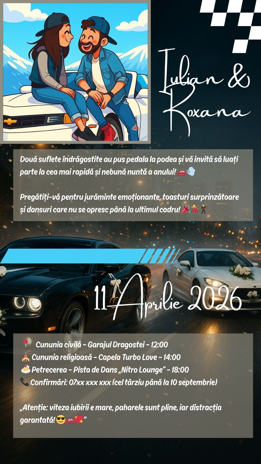 💌 Personalizare completăde la nume, locație, dată și oră, până la fotografii 📸 și mesaje text, fiecare detaliu este adaptat exact după cerințele tale. Tu decizi tonul invitației: elegant, romantic, amuzant sau modern.